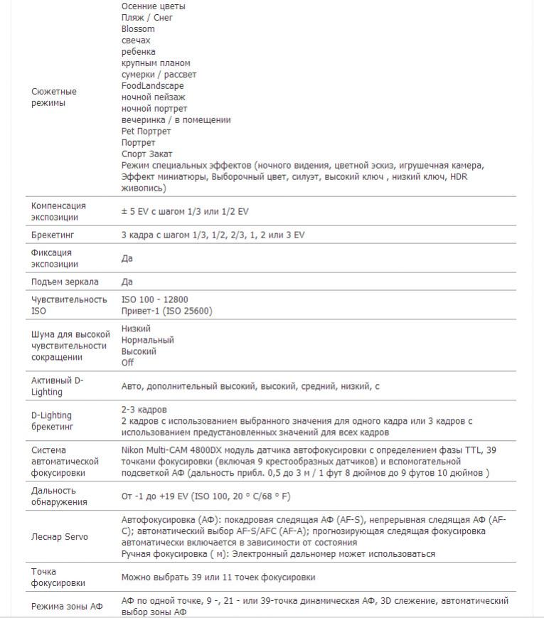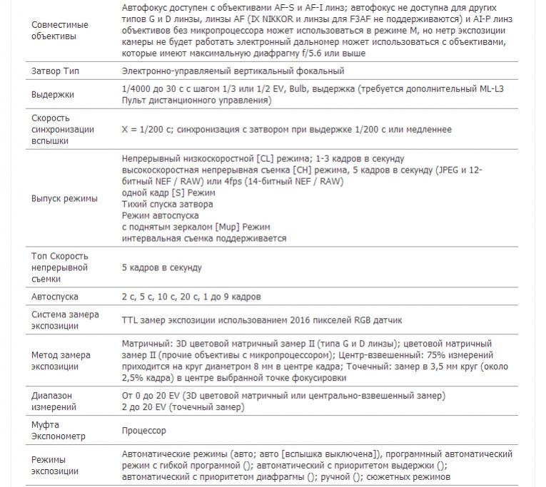 Минимальная выдержка равна 1/4000 с, выдержка синхронизации — 1/200 с. Скорость серийной съемки достигает 5 к/c. В режиме видеосъемки доступны разрешения вплоть до 1920 x 1080 пикселей при кадровой частоте до 60 к/с. Видеозаписи сохраняются в формате MPEG-4 или H.264. Камера оснащена стереофоническим микрофоном (есть возможность подключения внешнего стереомикрофона Nikon ME-1), громкоговорителем и выходом HDMI.