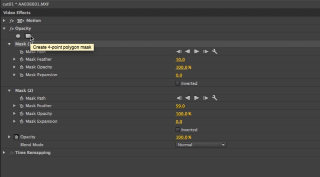 Инструменты Masking & Tracking - прописаны в постоянном разделе сразу после Opacity и имеет специальные овальные и прямоугольные маски (Create 4-point polygon mask), которые следуют за объектом. Данная функция маскирования и отслеживания, работает на технологии After Effects.